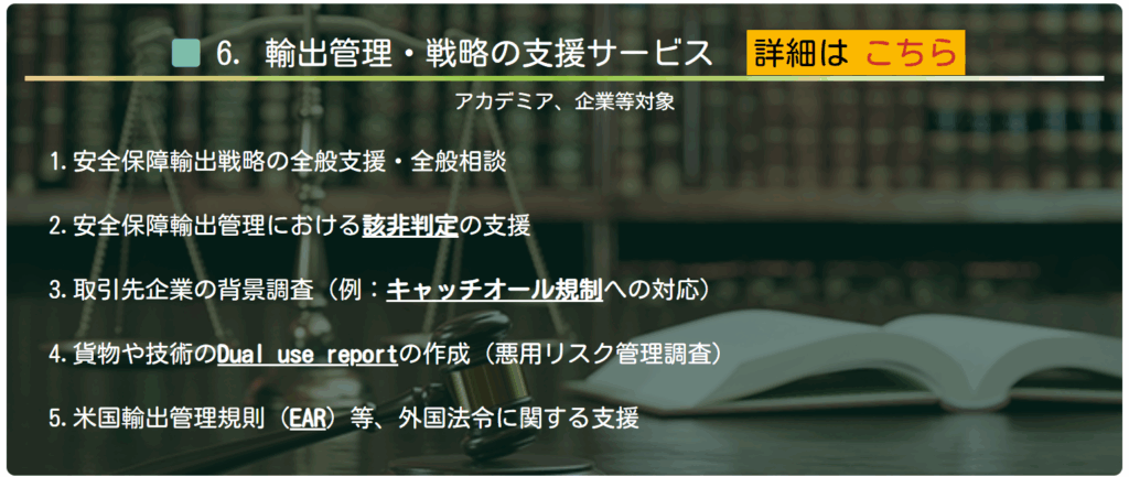 創業以来、弊社は、安全保障輸出管理に係る支援サービスを顧問または単発で実施してきました。2024年12月には独立したサービスとして提供開始しました。お陰様で、該非判定のみならず、輸出先企業調査、米国のEAR対応(再輸出・再移転規制、ECCN、EAR99対応など)含め、事業戦略、知財戦略はもちろん経営判断の観点を尊重した支援にご高評頂いております。